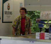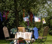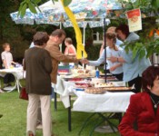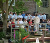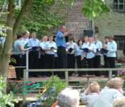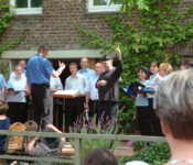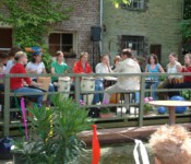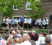 Die Idee für 2004 war, auf der Terrasse der wunderschönen Gartenanlage in der Schlesienstraße 30 (den Büderichern bekannt als ,,Alte Mühle“, in der unser Chormitglied Harald mit seiner Frau wohnt und dort ein ,,Kinderheim“ betreibt), ein Konzert unter freiem Himmel zu veranstalten, bei dem die Gäste im Schatten der Bäume bei Kaffee und Kuchen dem musikalischen Programm lauschen können.