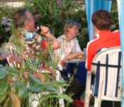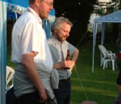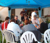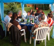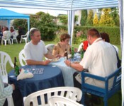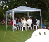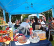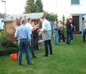 Steffi und Elmar stellten dafür spontan ihren wunderschönen Garten zur Verfügung. Grillfleisch und Getränke wurden besorgt, Ramazotti auf Eis gelegt, Pavillons aufgebaut, Salatbuffet fein hergerichtet, Gartentische nett dekoriert, so dass wir uns in gemütlicher Runde austauschen konnten.