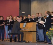 Flink wurde das Klavier an die richtige Position gerückt und wir sangen ,,Bridge over troubled water“ mit der Dynamik, die dem Stück den entsprechendem Ausdruck verlieh und die unser Chorleiter Wolfgang Bitter noch mit seiner einfühlsamen Klavierbegleitung unterstrich, so dass wir auch mit den sanften Klängen unseres zweiten Titels ,, Only time“ die Zuhörer berührten.